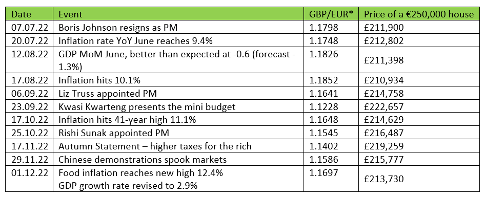 The GBP/EUR rate reached a high of 1.1852 in August and a low of 1.1228 in September following the chancellor’s mini budget. This change of less than 6 cents to the pound might not look like much, but when you apply it to a house that costs €250,000, it represents a change of £11,723 in the space of just 6 months.