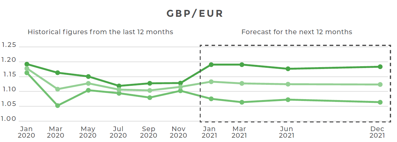 After a brief spike at the beginning of this year, the dollar has been weaker recently in anticipation of a Biden Presidency. The banks predictions show a huge disparity for this pairing over the next 12 months, with forecasts ranging from 1.19 to 1.50!