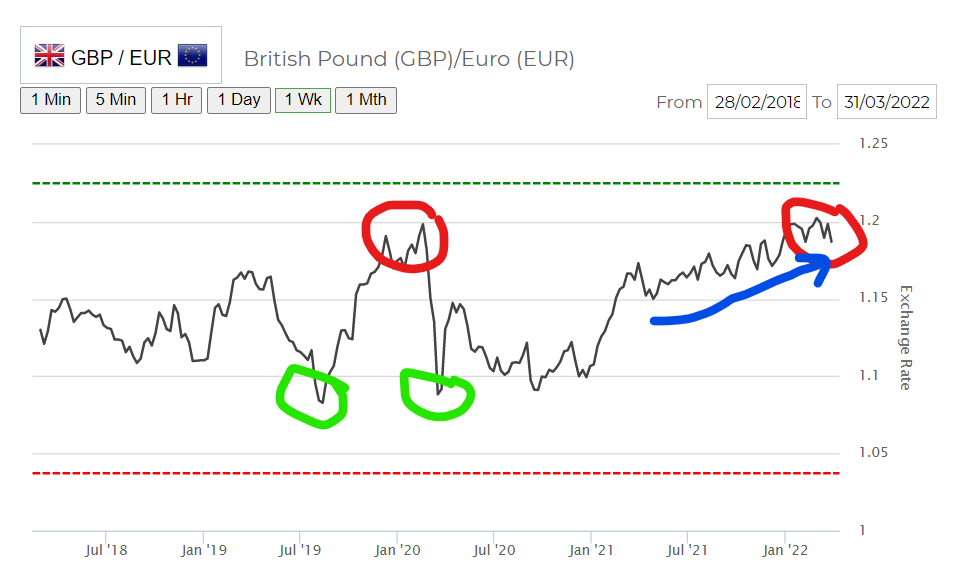 Several times since the start of 2022 the pound has reached over €1.20 against the euro. It’s the first time that GBP/EUR has been there for more than a day or two since before the 2016 referendum. Indeed on 7 March it reached close to €1.22, but only for one morning.